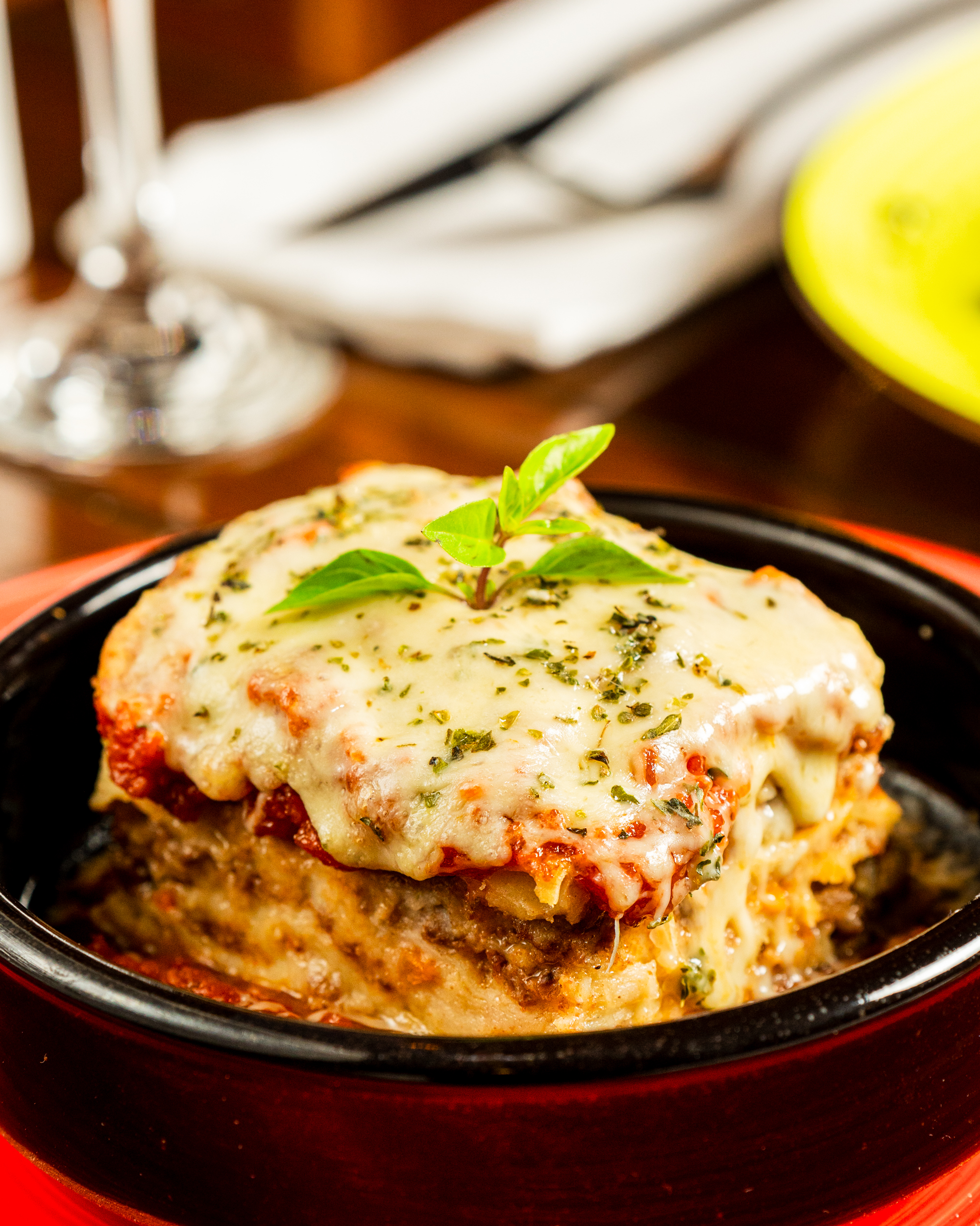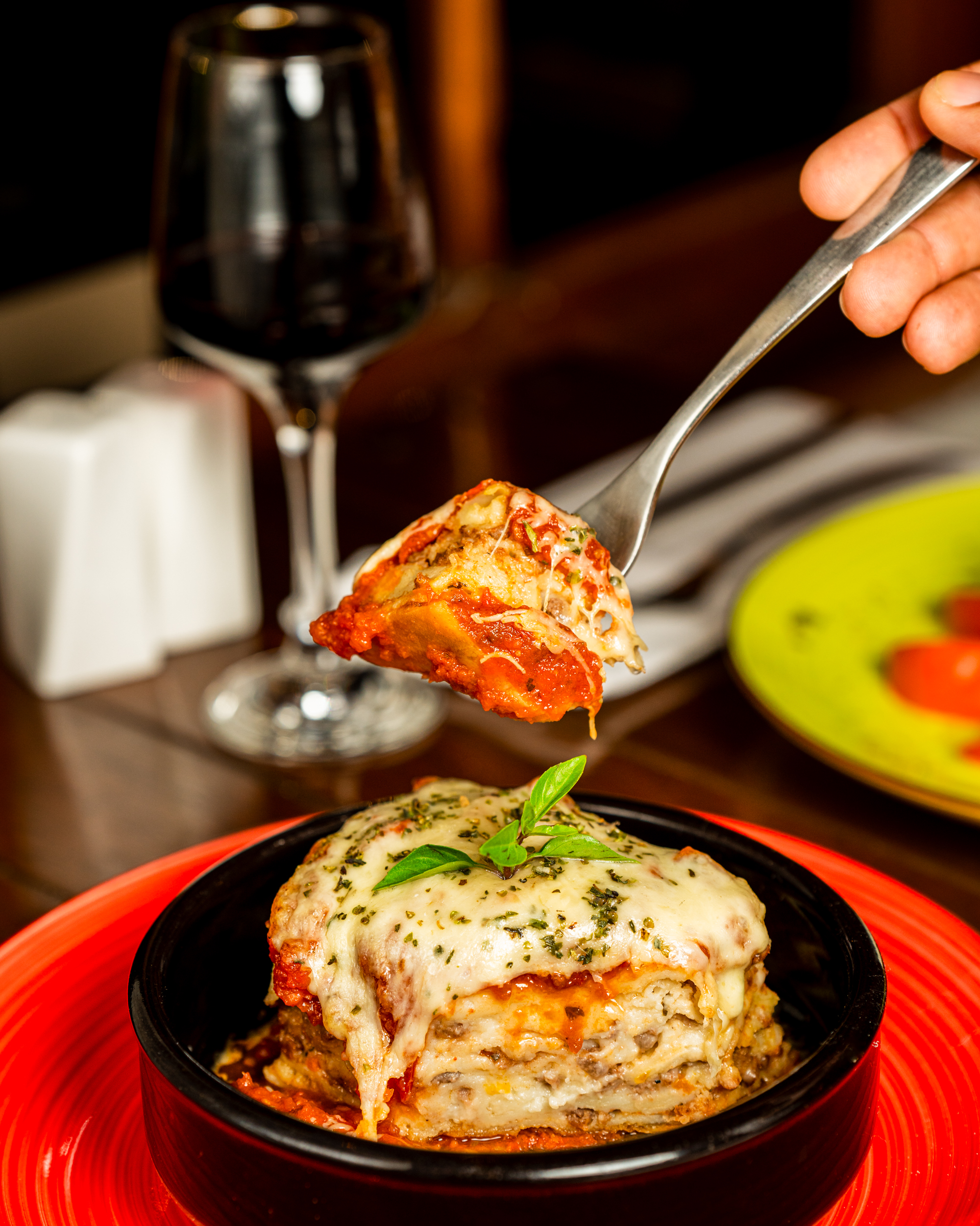 Lasagna de Carne: Capas de pasta fresca, carne molida sazonada, y una rica salsa de tomate. Entre las capas, el queso ricotta y el mozzarella se funden a la perfección, creando una textura cremosa